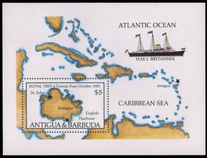 Home Foreign Miniature & Souvenier Sheets A-MS ANTIGUA-MS ANTIGUA 1985-Map of Antigua, Royal Visit, M/s, MNH, S.G. MS 968