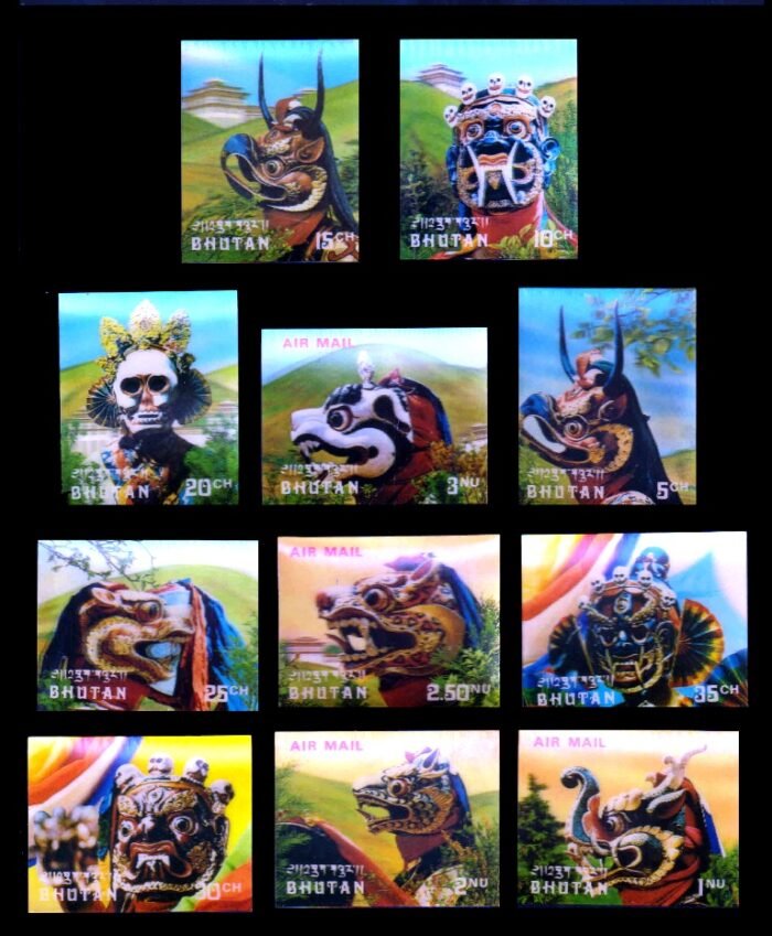 Home Exotic-Unusual & Odd Shaped Stamps EXOTIC & UNUSUAL STAMPS BHUTAN – 11 Different, 3D Mask Series Stamps