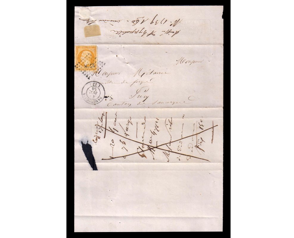 FRANCE 1853 – Napolean III, Imperf Stamp, 10 cent Yellow, Used on Letter, Dated 8 Dec, 1856, As Per Scan