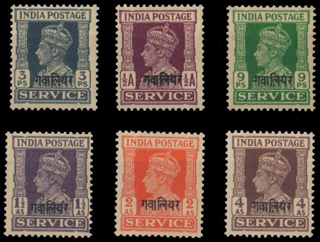 GWALIOR STATE – 6 Different, Mint Stamps, King George VI Official Stamps