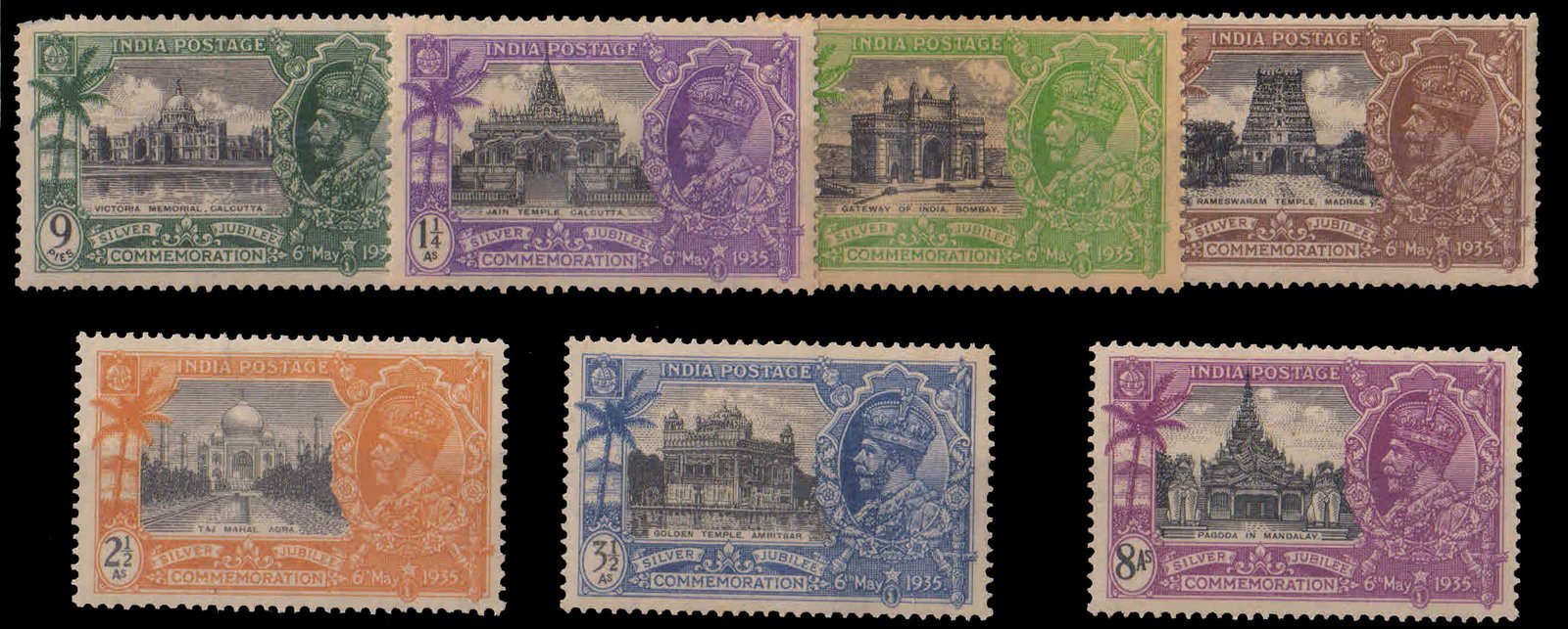 INDIA 1935-Silver Jubilee Pictorial Series, King George V, Taj Mahal, Victoria Memorial, Jain Temple, Golden Temple, Set of 7, Mint Hinged