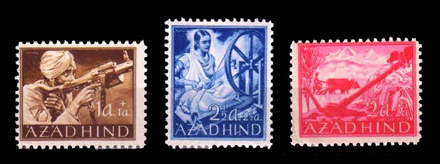INDIA 1943 – AZAD HIND Stamps, 3 Different Perforated Stamps, Mint White Gum