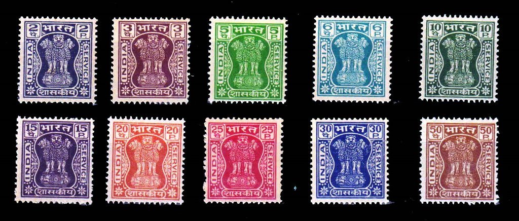 INDIA 1967 – Ashokan Capital Official Postage Stamps, Watermark Large Star and INDIA GOVT, No Gum Indigenous Paper, S.G. 0200-0209, Cat. £ 35