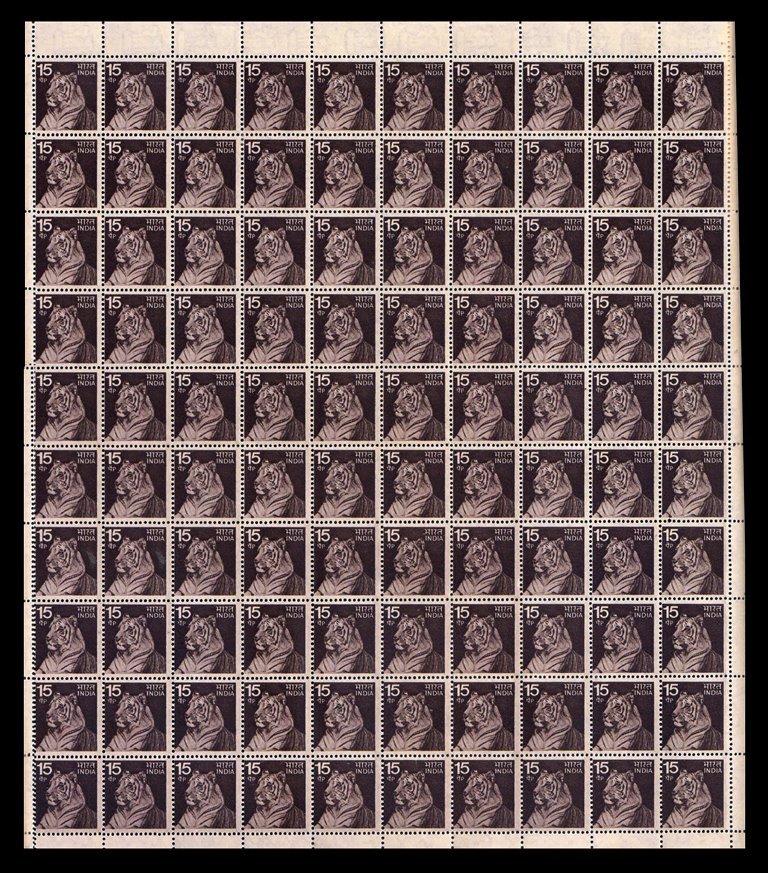 INDIA 1974 – Tiger, Dark Background 15P., Sheet of 100 Stamps, MNH