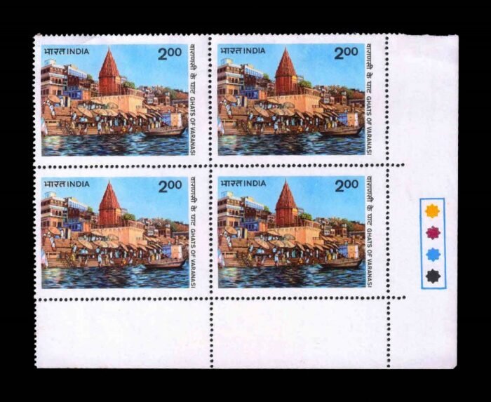 Home INDIA TRAFFIC LIGHT ISSUES 1983-T.L. INDIA 1983 – Ghats of Varanasi, Tourism, Corner Block of 4 with Traffic Light, MNH