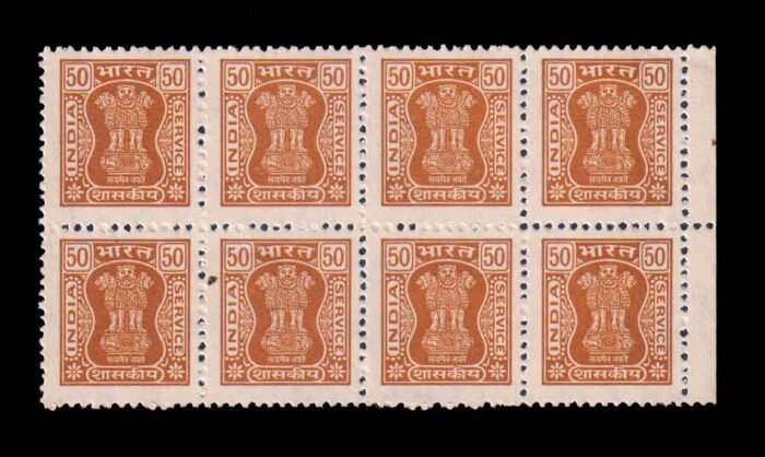 INDIA 2000 – Official Stamp 50P., Smaller Design, Watermark Ashokan Capital Inverted, Block of 8 Stamps, Error, Mint Never Hinged, S.G. 0269b