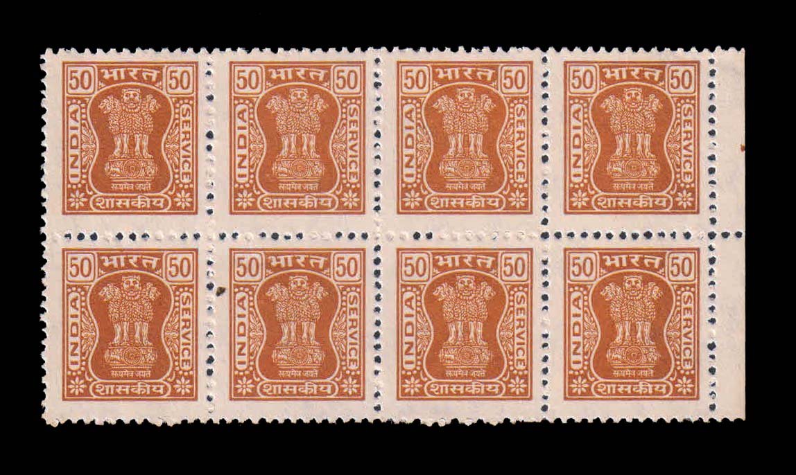 Home India Constant Varieties - Error INDIA 2000 – Official Stamp 50P., Smaller Design, Watermark Ashokan Capital Inverted, Block of 8 Stamps, Error, Mint Never Hinged, S.G. 0269b