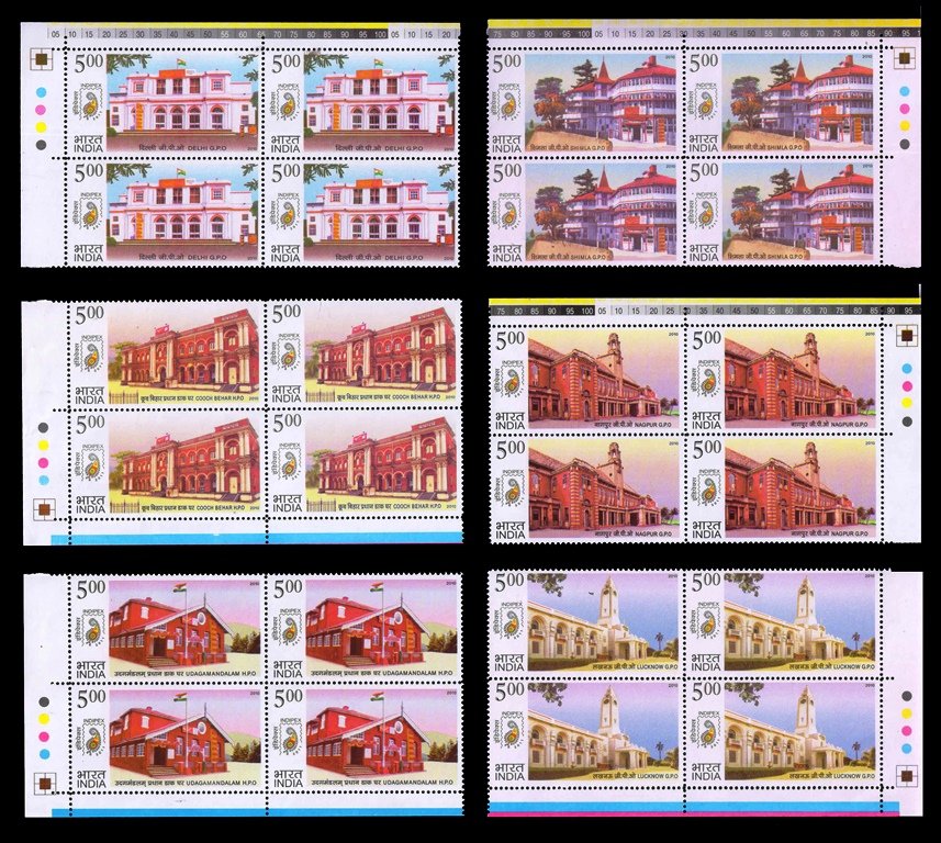 Home INDIA TRAFFIC LIGHT ISSUES 2010-T.L. INDIA 2010 – Postal Heritage Buildings, Set of 6 Stamps, Corner Blocks with Traffic Light, MNH