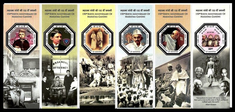 INDIA 2019 – 150th Birth Anniversary of Mahatma Gandhi, Miniature Sheet of 6 Odd Shaped Stamps, S.G. MS 3629