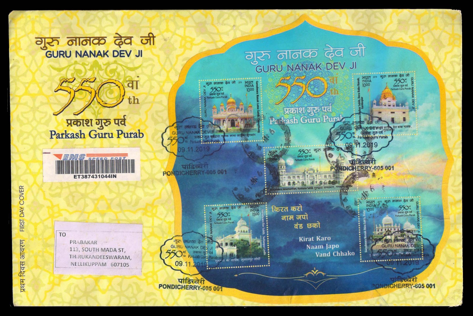 INDIA 9-11-2019, Guru Nanak Dev Ji, Prakash Guru Purab, Miniature Sheet on First Day Cover, commercial Used, Speed Post Nellikuppam to pudupalayam
