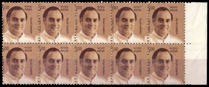INDIA Definitive, 5 Rs. Rajiv Gandhi-Perforation Shift, Error as per Scan, Block of 10, MNH