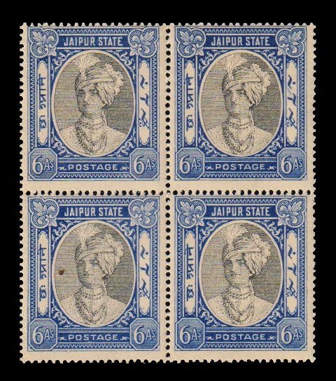 JAIPUR STATE 1946 – Maharaja Sawai Man Singh, 6Anna Black and Pale Blue, Block of 4 MNH, S.G. 65, Cat. Value ? 18 Each Stamp