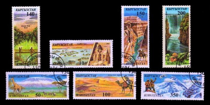 Home Foreign Country Composition & Packets (A to Z) K-USED Kyrgyzstan- KYRGYZSTAN 1995 – Natural Wonders of the World, River Nile, Mount Kilimanjaro Sahara Desert, Amazon River, Grand Canyon, Victoria Fall, Mount Everest, Set of 7, Used, S.G. 98-104, Cat. Value £ 5.25