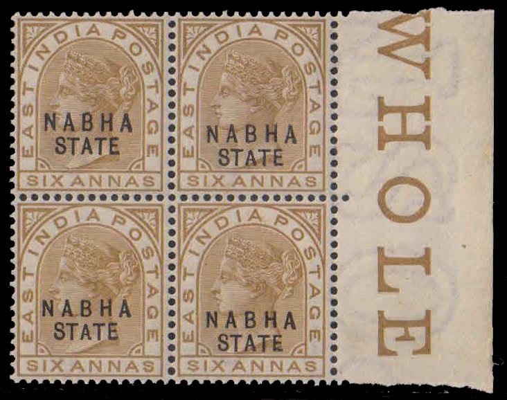 NABHA STATE 1889 , S.G. No. 25 , 6 As , Olive Bistre Queen Victoria , Block Of 4 , Cat . £ 100.00