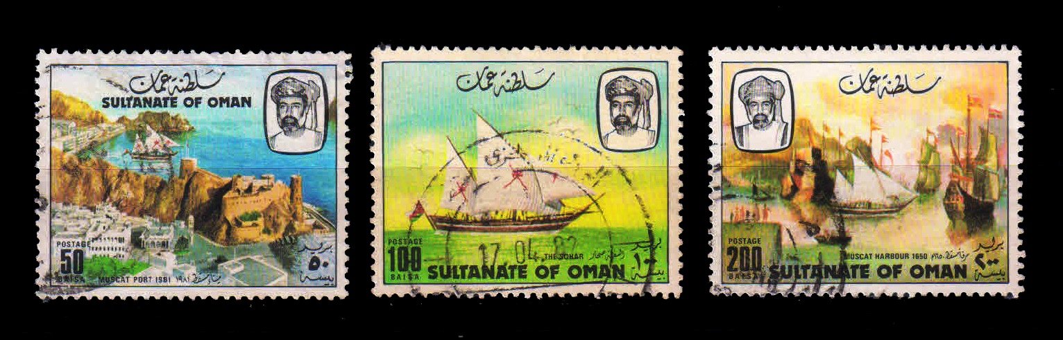OMAN 1981 – Retracing the Voyage of Sinbad, Muscat Port, Harbour, 3 Different Stamps, Used, S.G. 250, 251, 253, Cat. £ 11