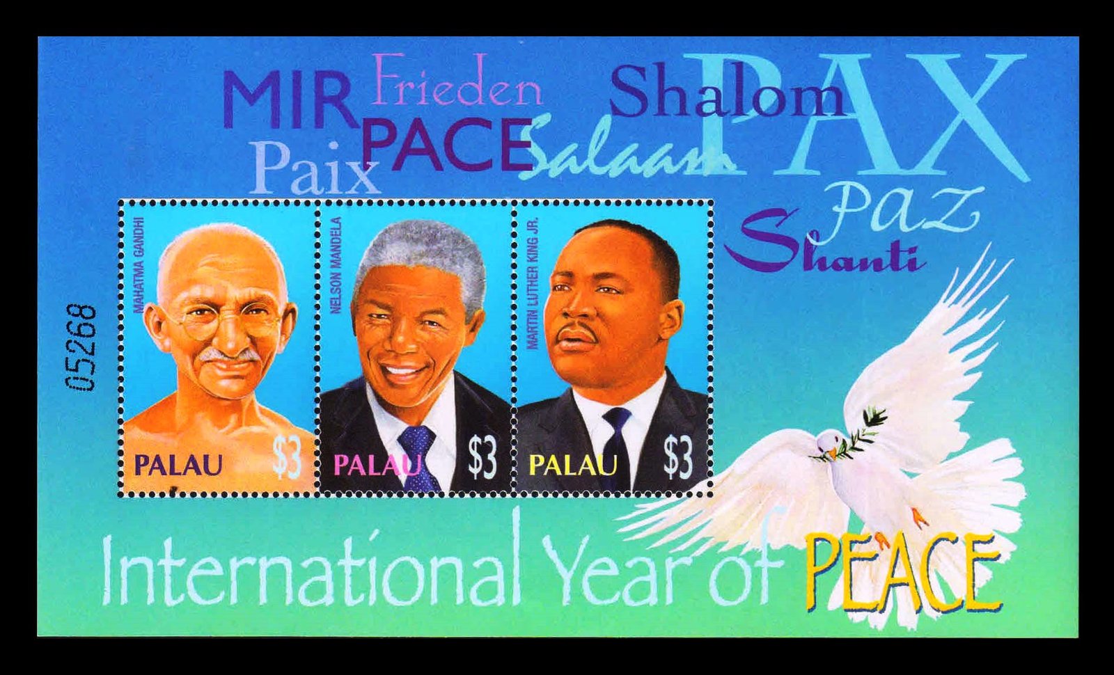 PALAU 2004 – International Year of Peace, Mahatma Gandhi, Nelson Mandela, Martin Luther King, Miniature Sheet of 3 Stamps, MNH, S.G. MS2044, Cat. £ 35