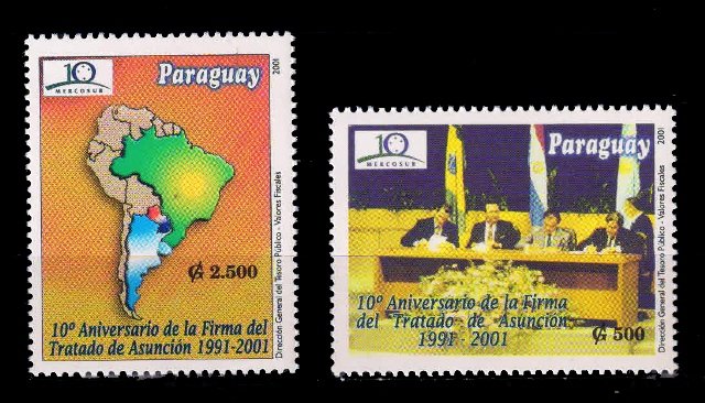 PARAGUAY 2001 – Map of South America, 10th Anniversary of Asuncion Treaty, Co-Operation Flags, Set of 2 Stamps, MNH, S.G. 1619-1620, Cat. £ 5