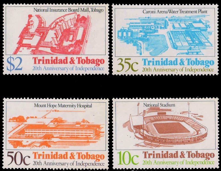 TRINDAD & TOBOGO 1982-20th Anniv. of Independence Stadium, Water Plant, Hospital, Mall, Set of 4, MNH, S.G. 618-21-Cat ? 4-