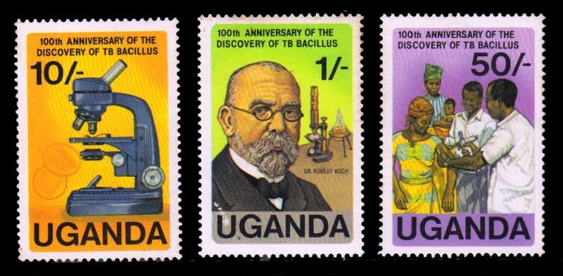 UGANDA 1982 – Dr. Robert Koch, Cent. of Discovery of Tubercle Bacillus, Microscope, Set of 3, MNH, S.G. 369-371, Cat. ? 2.51